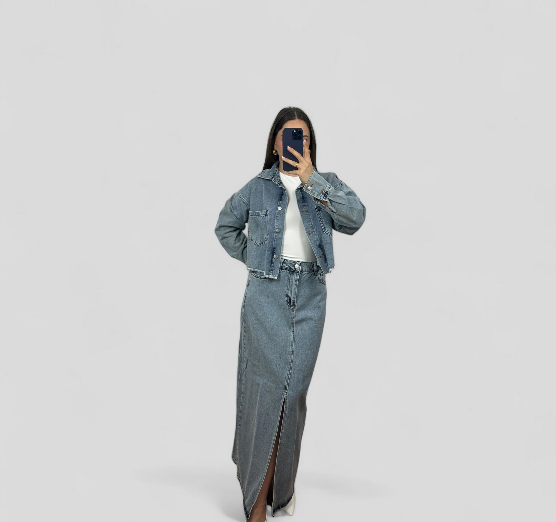 This stylish denim set features a fitted denim blouse and a long denim skirt with an elegant slit. Made from sturdy, 100% cotton denim for a timeless, comfortable look. Perfect for a casual yet polished outfit.