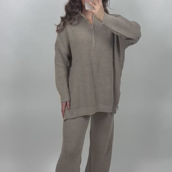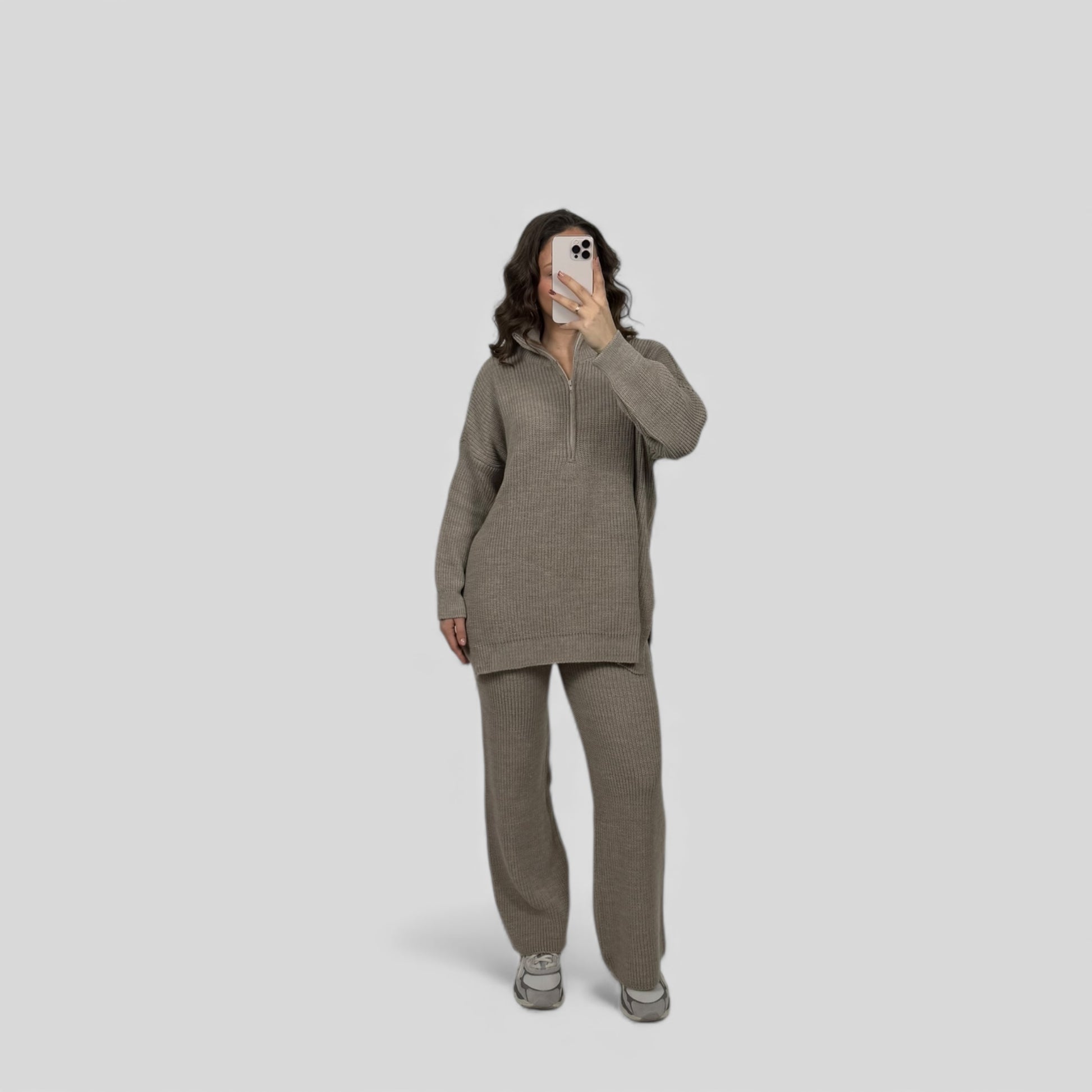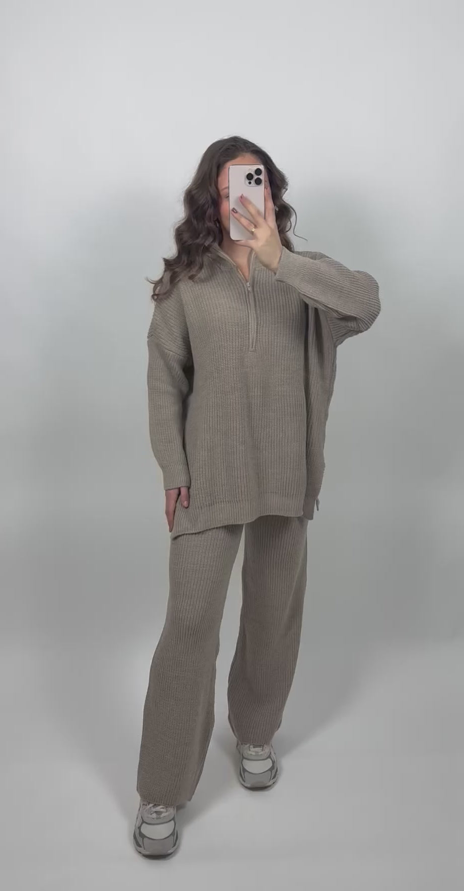 Deze elegante knit twinset biedt de perfecte balans tussen comfort en stijl. De set bestaat uit een losvallende trui met ritssluiting aan de hals en een bijpassende broek met wijde pijpen. De zachte breistructuur en oversized pasvorm zorgen voor een moderne, ontspannen look die toch verfijnd oogt. Ideaal voor zowel casual dagen als stijlvolle momenten buitenshuis.