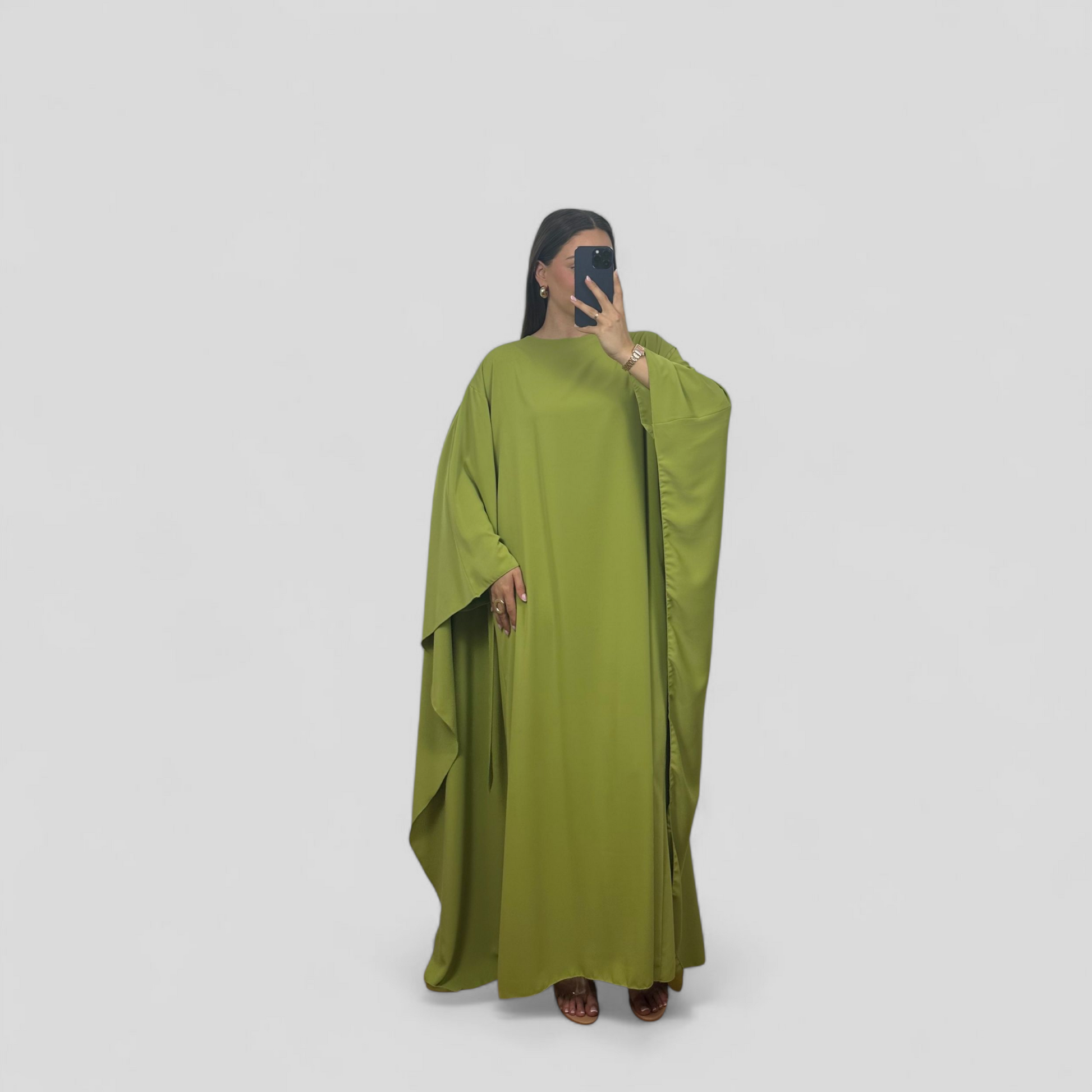 This elegant abaya has a loose silhouette and flared sleeves, creating a comfortable yet stylish look. Made of a flowing fabric that drapes beautifully. Ideal for everyday wear or special occasions where comfort and style come together.