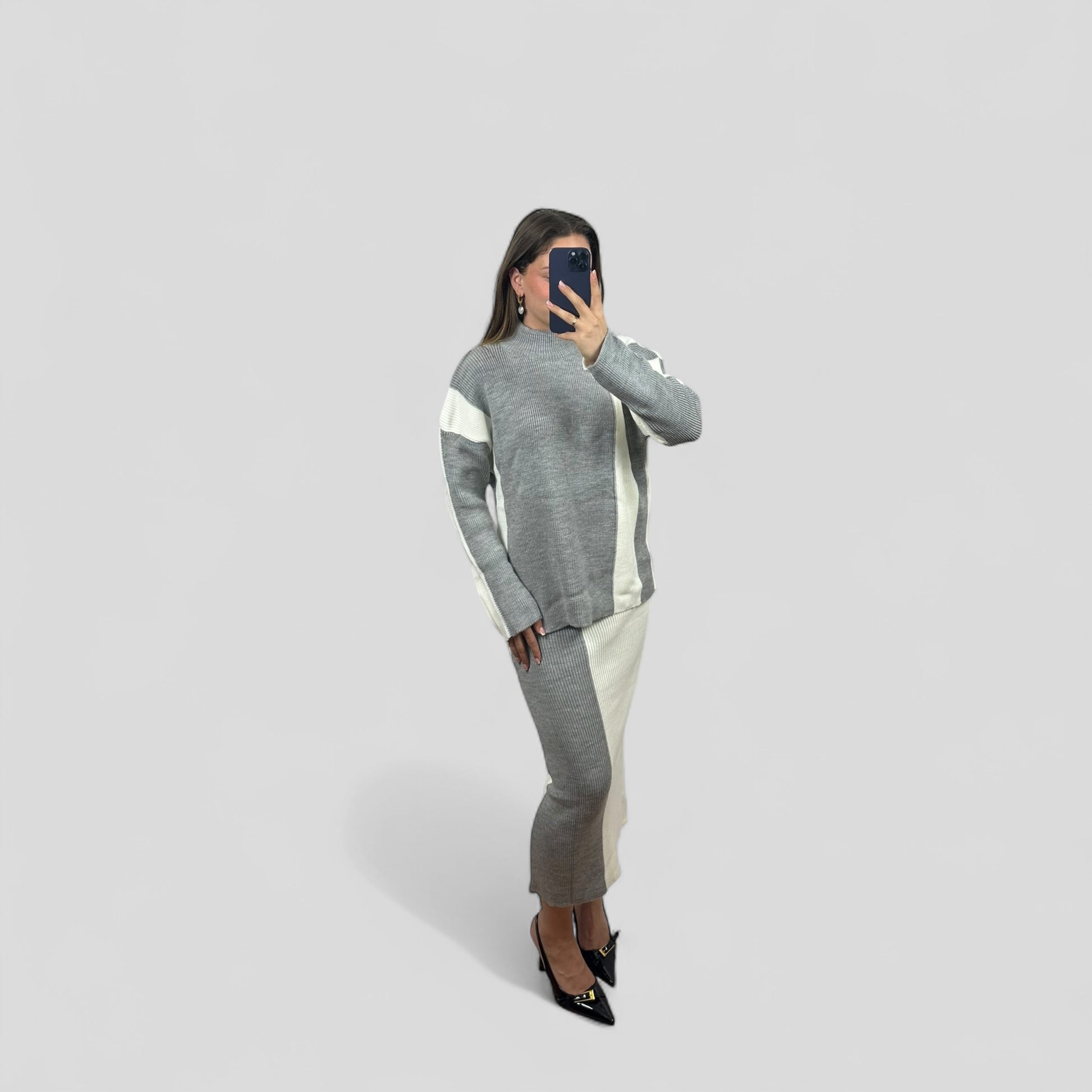 Deze gebreide tweedelige set combineert elegantie met ultiem comfort. Het minimalistische design wordt versterkt door verticale en diagonale lijnen, die een flatterend en verfijnd silhouet creëren. De zachte, rekbare knitstof zorgt voor een comfortabele pasvorm, terwijl de combinatie van de losse top en de rechte rok een tijdloze uitstraling geeft. Perfect voor zowel casual-chic gelegenheden als een stijlvolle werkdag.