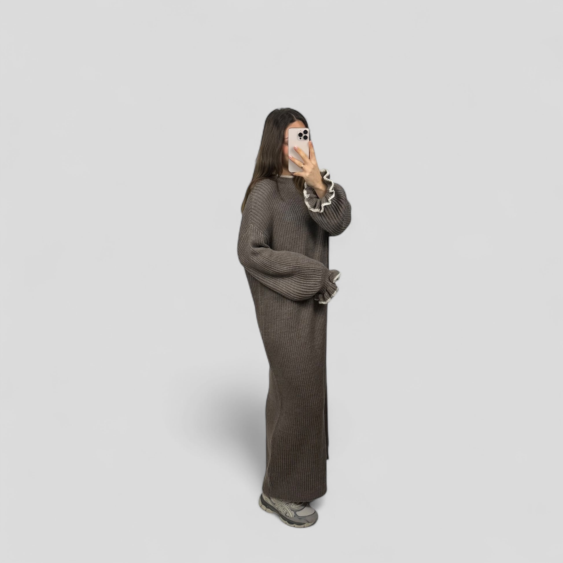 Deze lange gebreide jurk combineert comfort met een stijlvolle uitstraling. De rechte, losse pasvorm valt soepel langs het lichaam en zorgt voor bewegingsvrijheid, terwijl de hoge hals en lange mouwen warmte en elegantie bieden. De subtiele ribstructuur en de speelse volantdetails aan de mouwboorden geven de jurk een unieke en verfijnde look. Ideaal voor cosy dagen thuis of een chique winterse outfit.