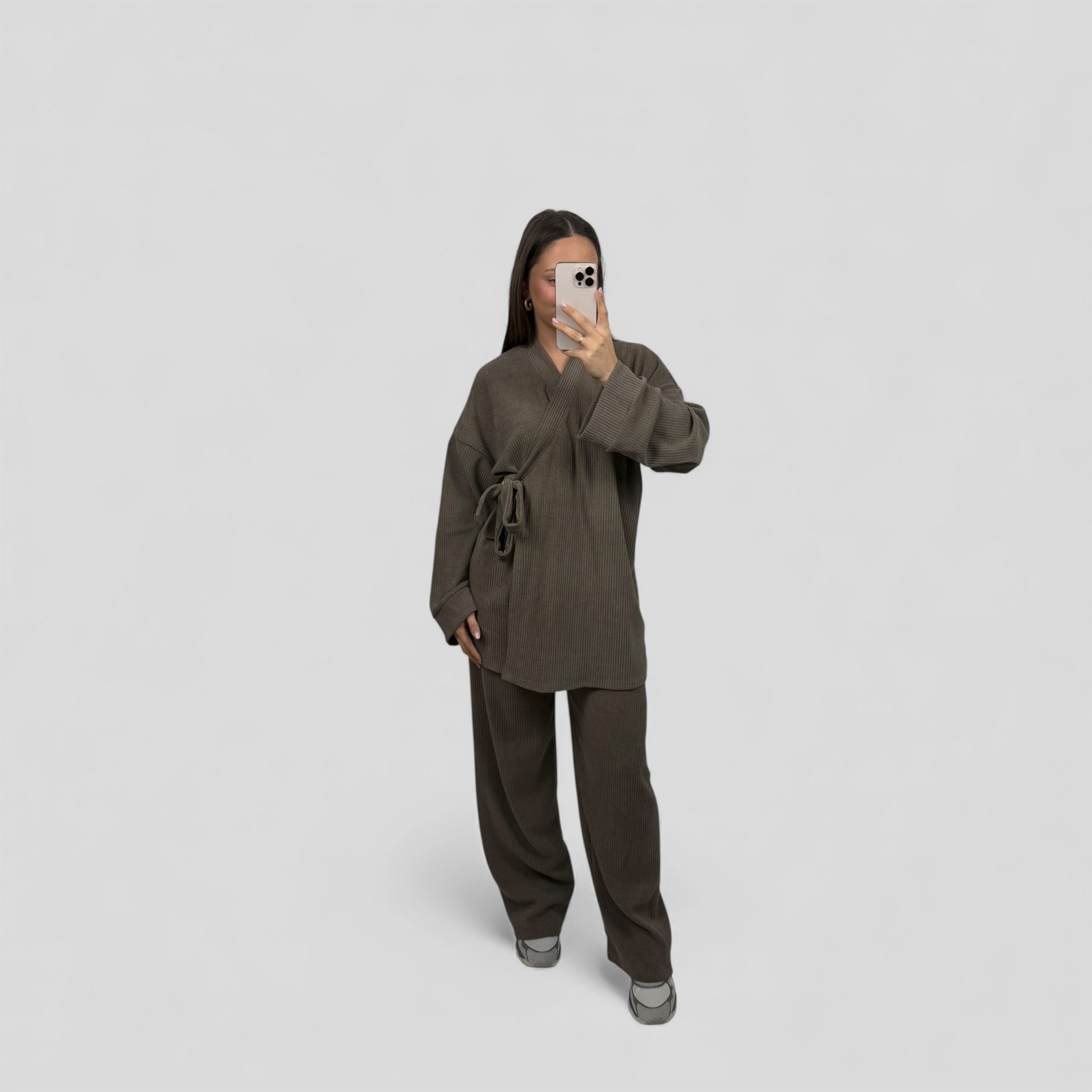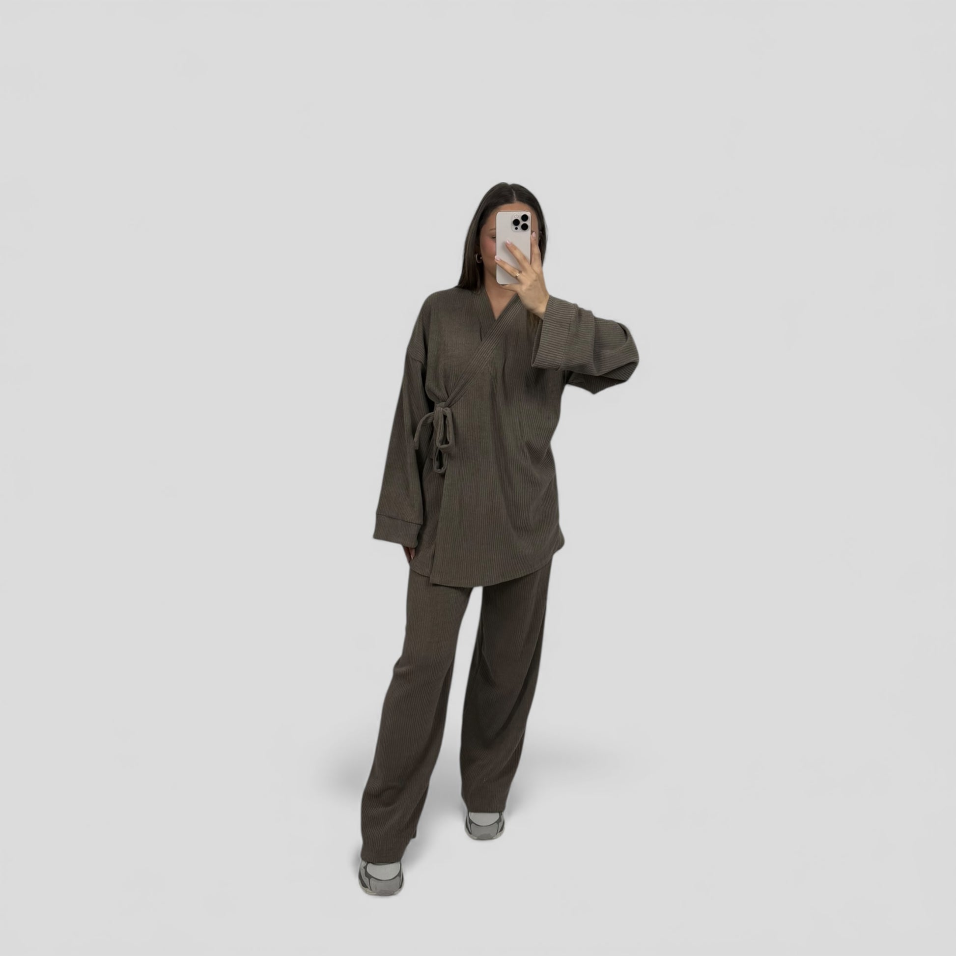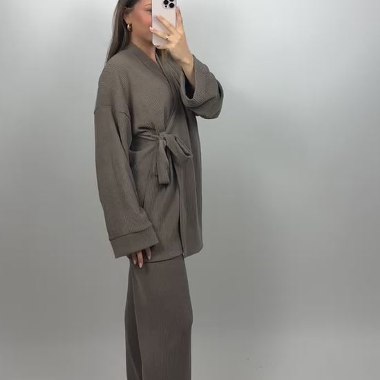 Deze stijlvolle twinset is de perfecte combinatie van comfort en elegantie. De set bestaat uit een losvallende top met strikceintuur en een rechtvallende broek met wijde pijpen. De ribstructuur geeft de stof een moderne uitstraling, terwijl de elastische samenstelling zorgt voor een comfortabele pasvorm. Ideaal voor zowel casual gelegenheden als een nette, modieuze look.