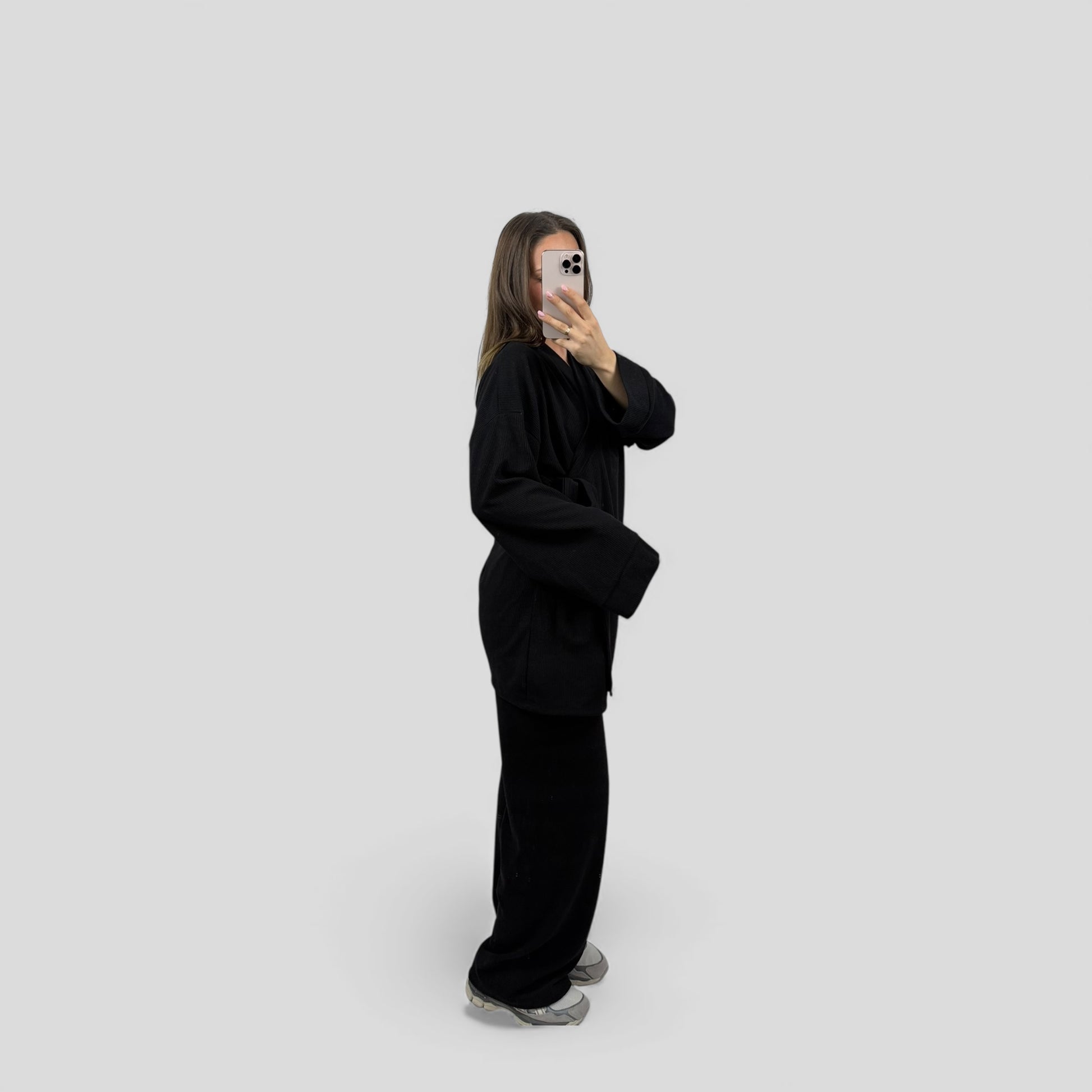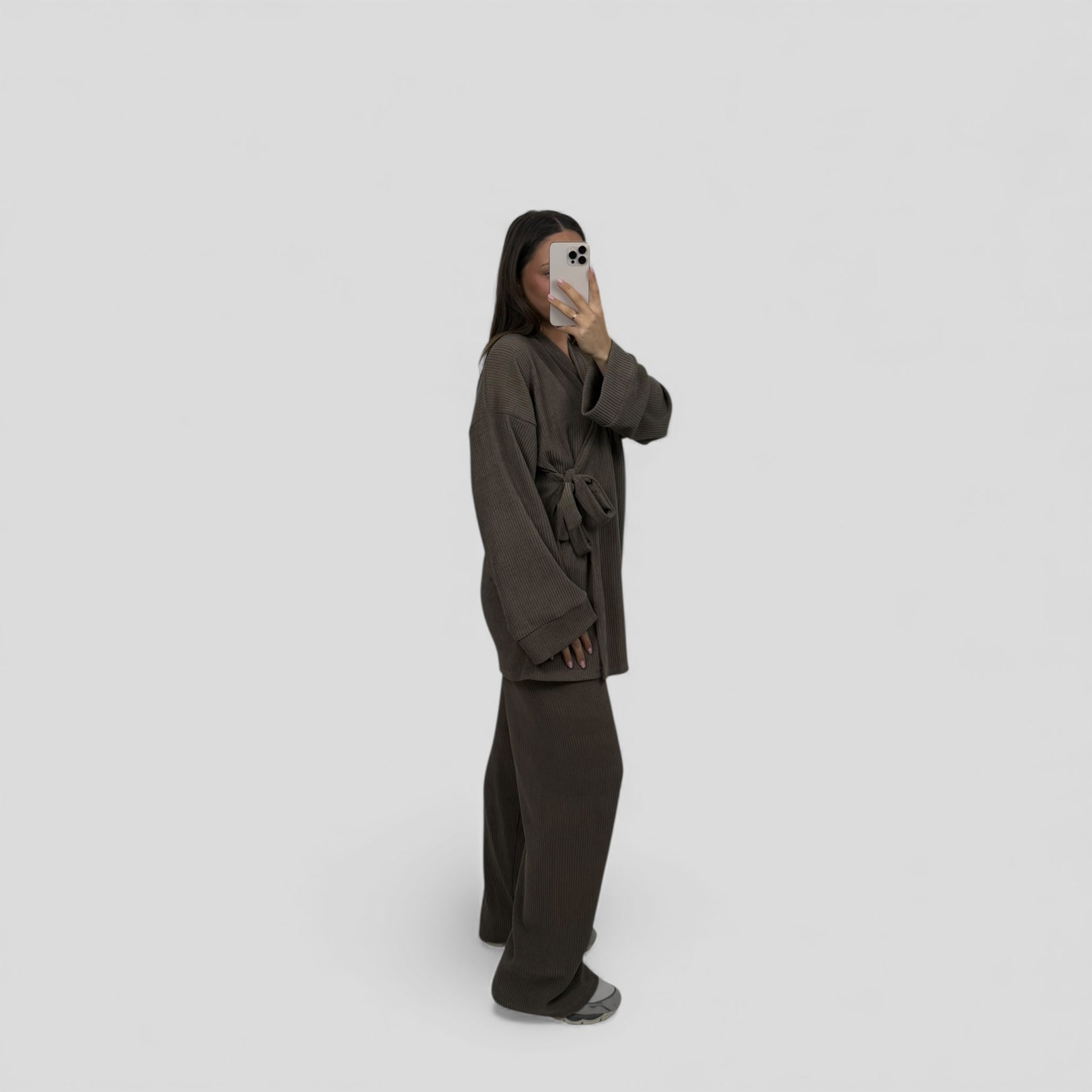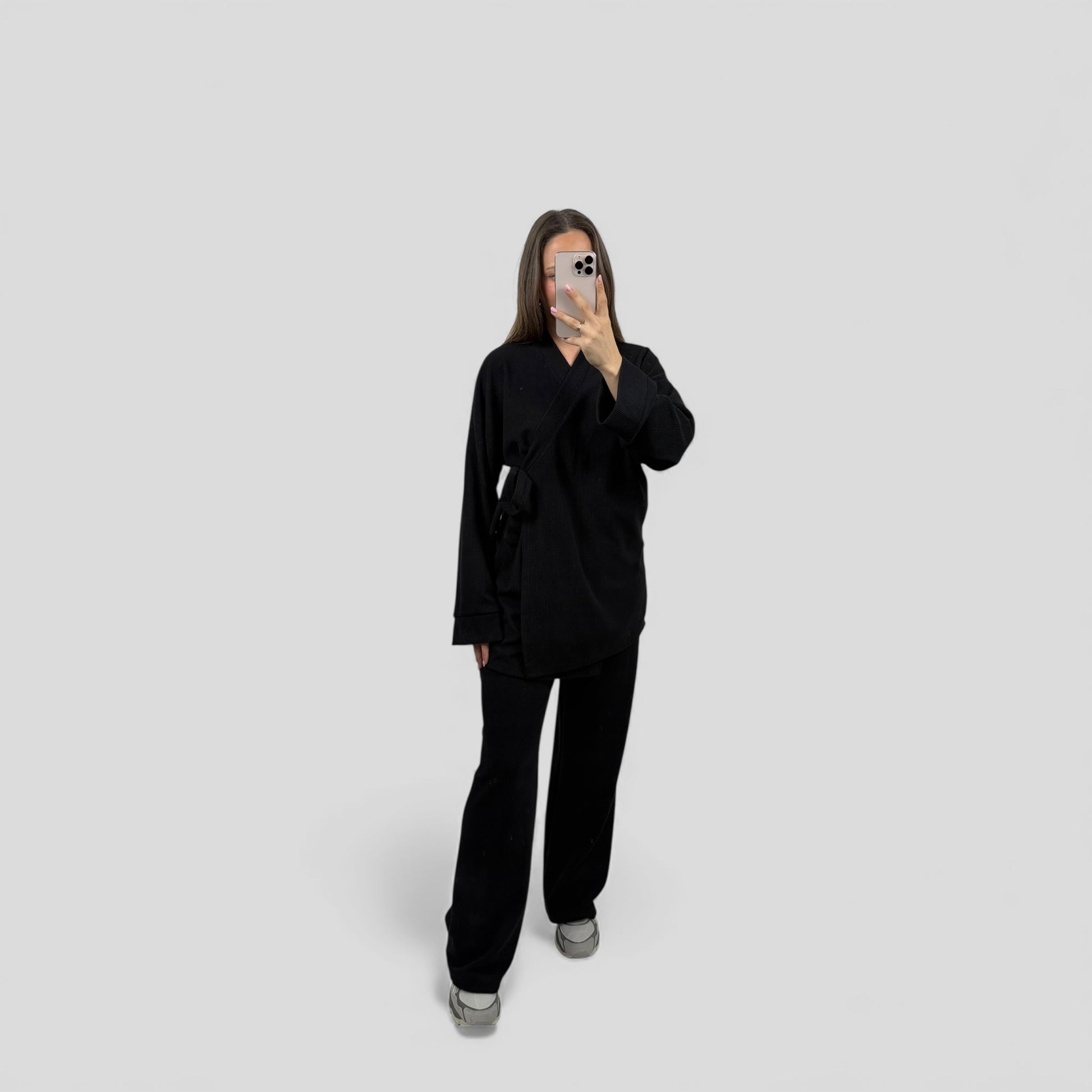 Deze stijlvolle twinset is de perfecte combinatie van comfort en elegantie. De set bestaat uit een losvallende top met strikceintuur en een rechtvallende broek met wijde pijpen. De ribstructuur geeft de stof een moderne uitstraling, terwijl de elastische samenstelling zorgt voor een comfortabele pasvorm. Ideaal voor zowel casual gelegenheden als een nette, modieuze look.