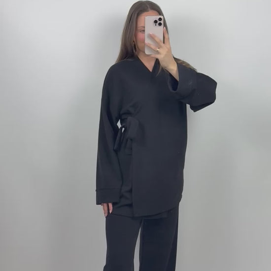 - Set van 2 delen (top met strikceintuur + wijde broek)