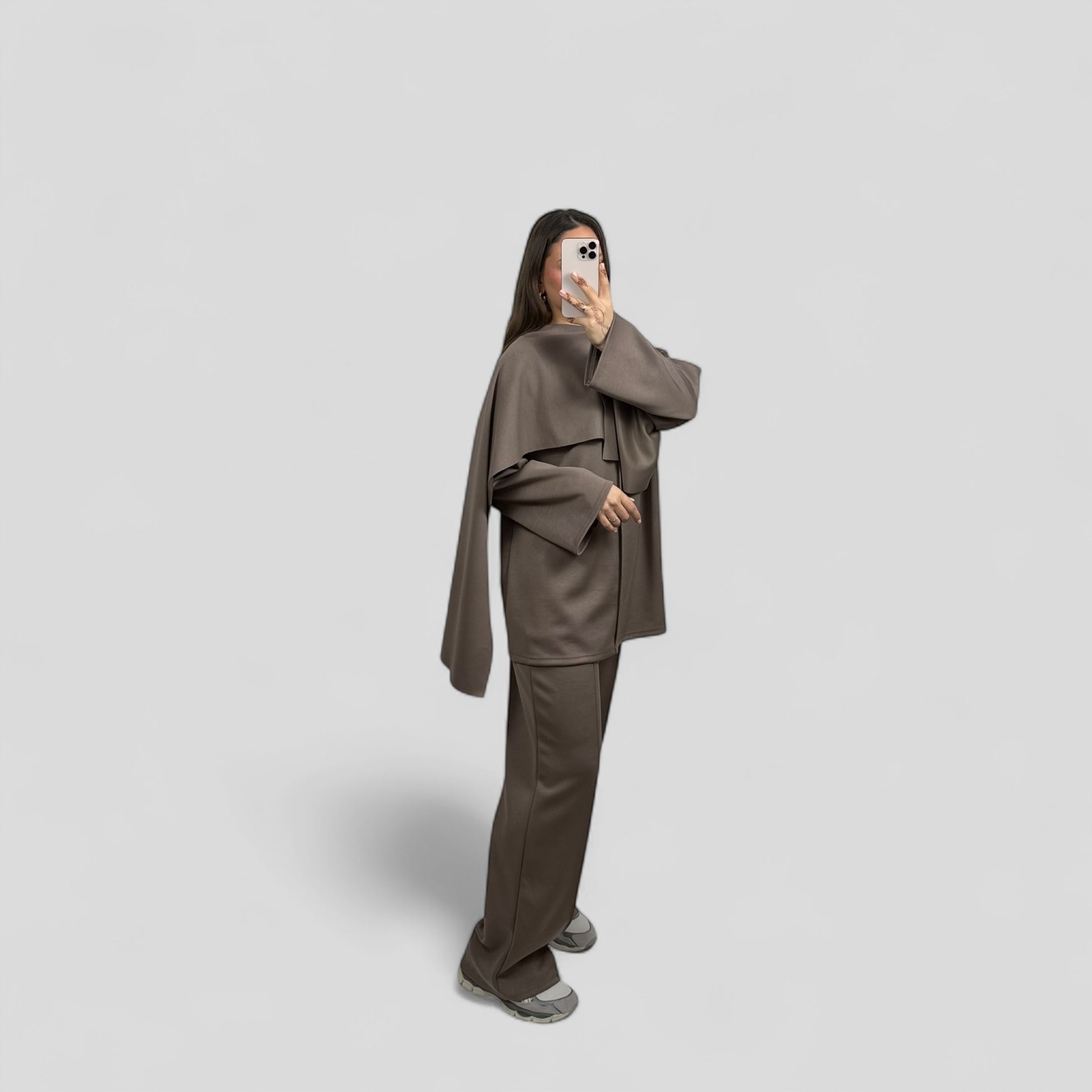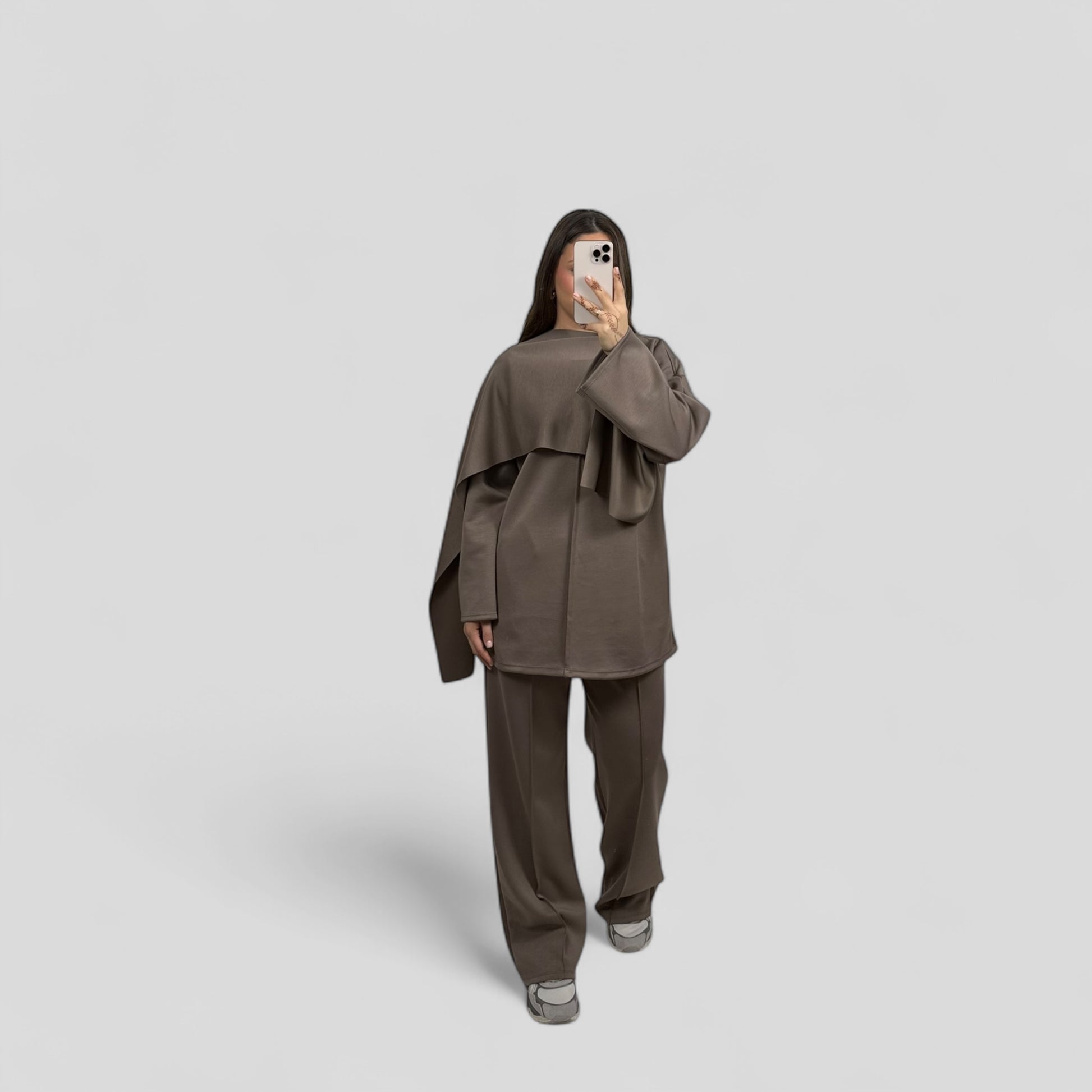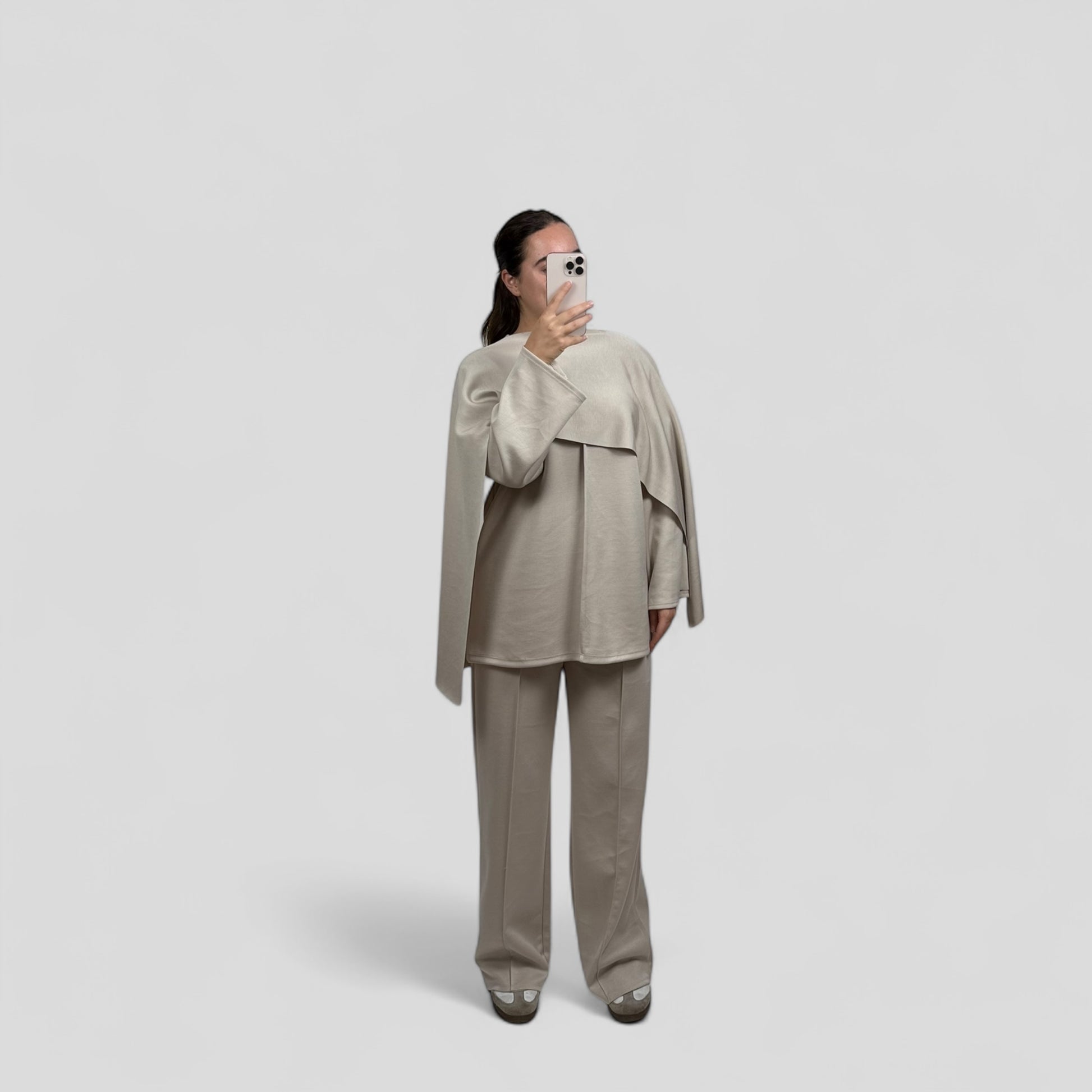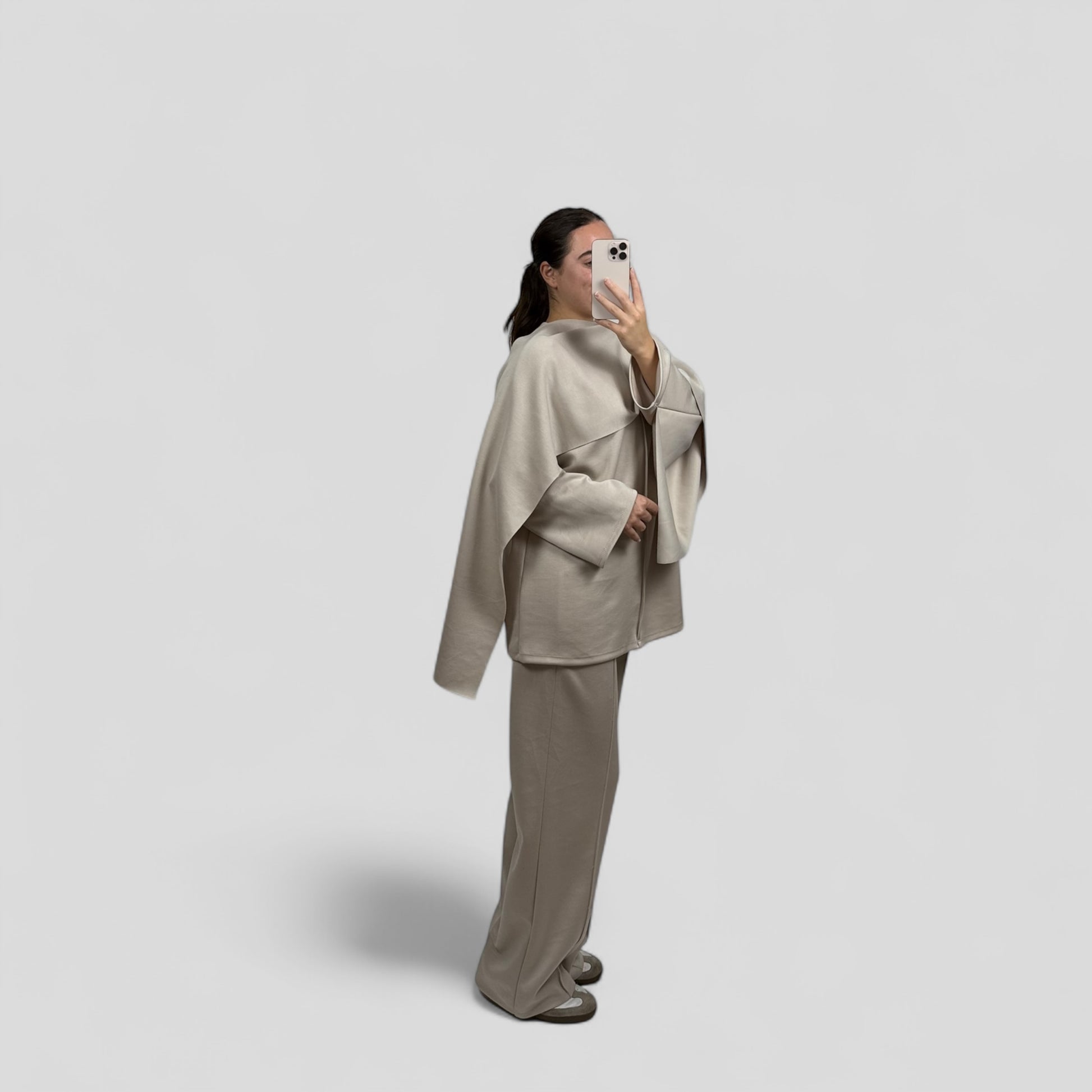 De Serenity Lounge Set combineert minimalisme met elegantie. De losvallende pasvorm en vloeiende stof geven deze set een moderne, verfijnde uitstraling. De top met wijde mouwen en rechte pantalon creëren samen een moeiteloze, stijlvolle look die zowel comfortabel als chic is. Perfect voor een rustige dag thuis of een casual dagje uit.