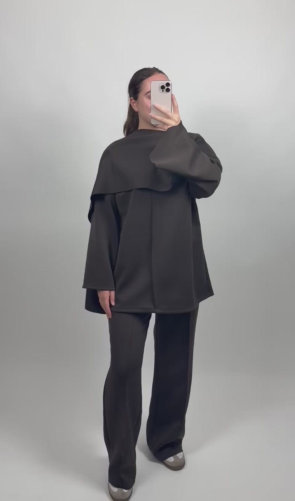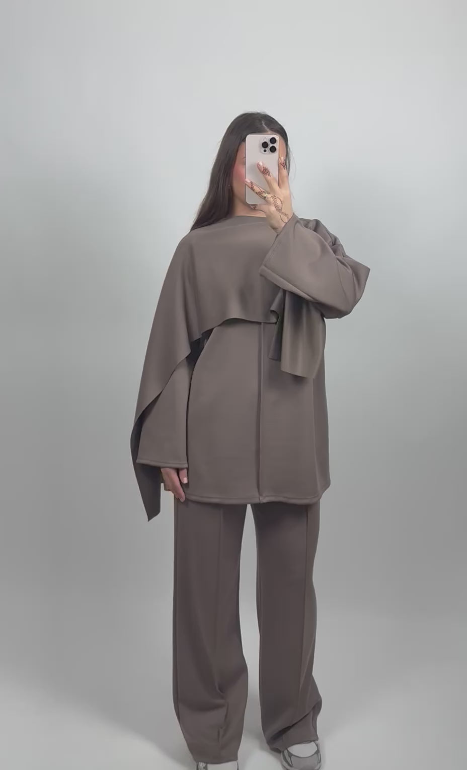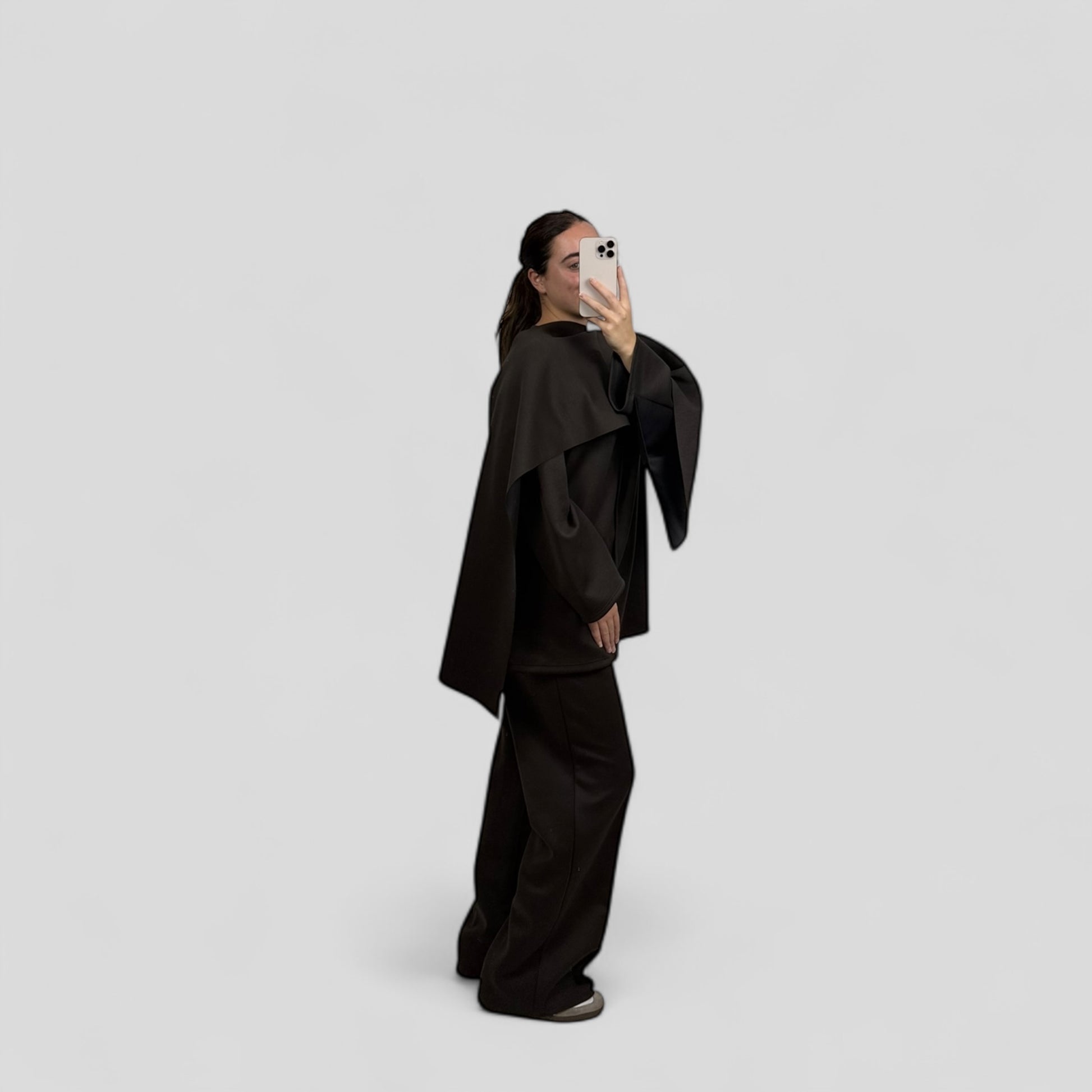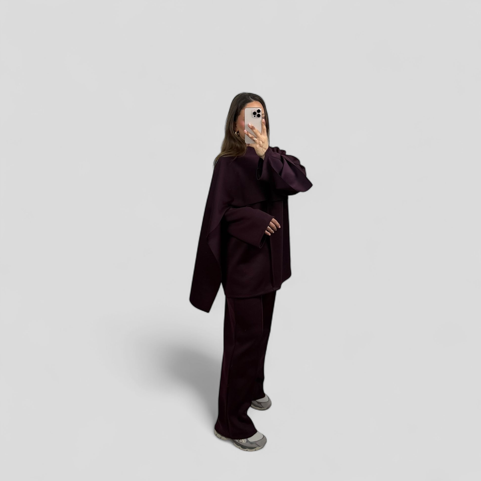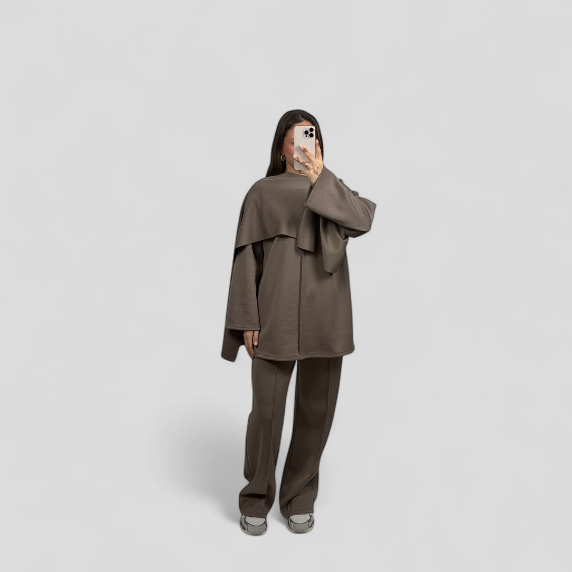 De Serenity Lounge Set combineert minimalisme met elegantie. De losvallende pasvorm en vloeiende stof geven deze set een moderne, verfijnde uitstraling. De top met wijde mouwen en rechte pantalon creëren samen een moeiteloze, stijlvolle look die zowel comfortabel als chic is. Perfect voor een rustige dag thuis of een casual dagje uit.