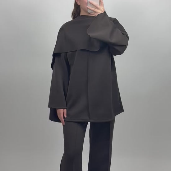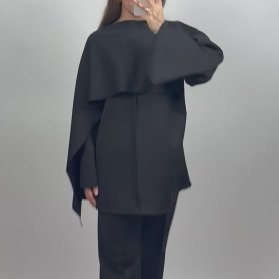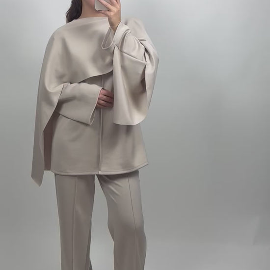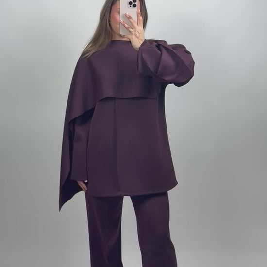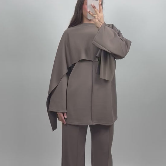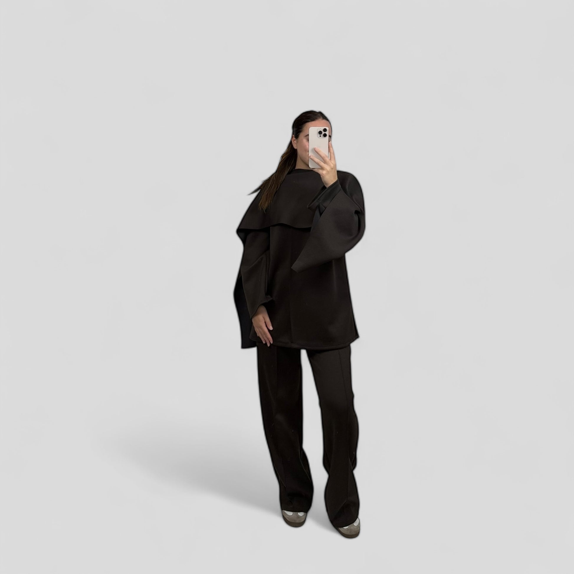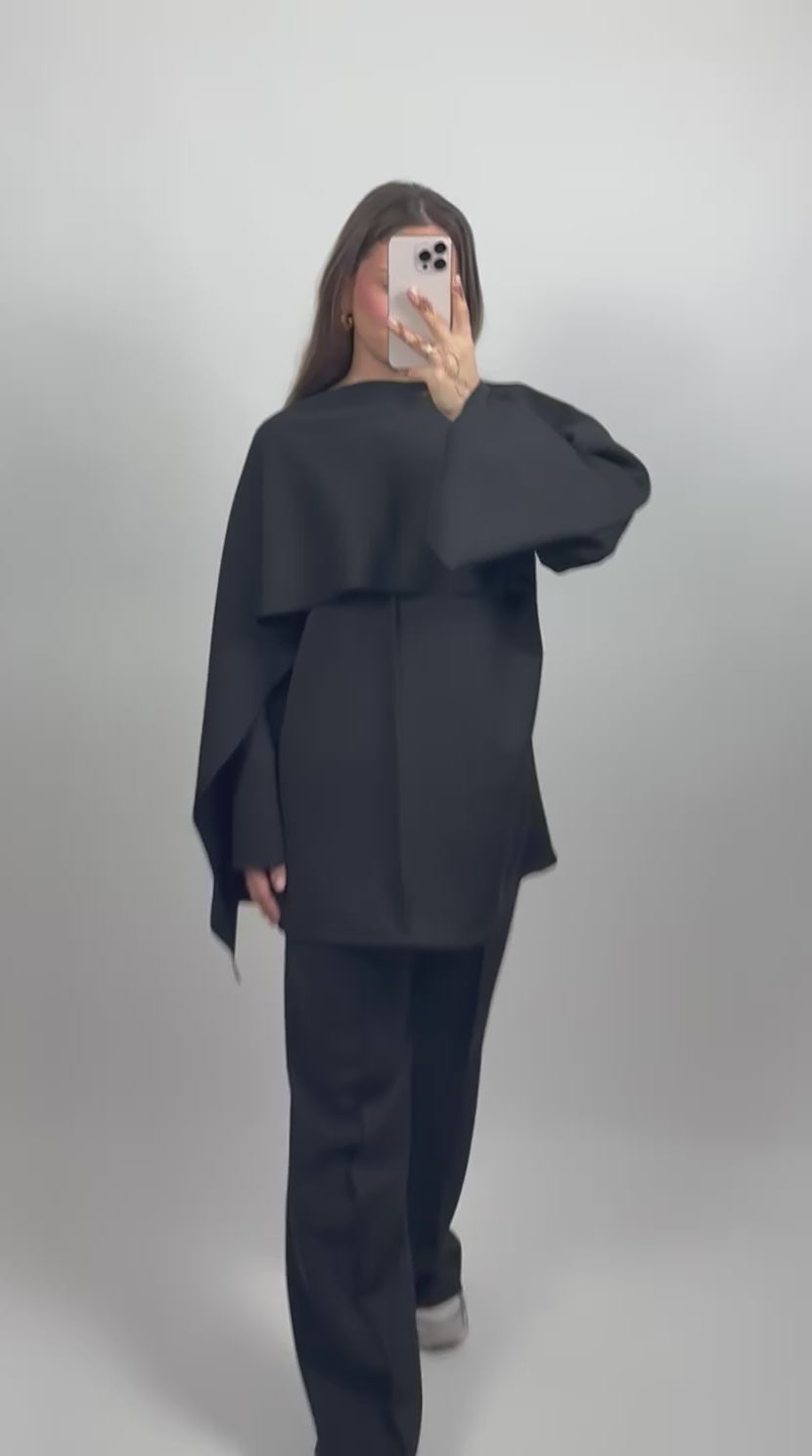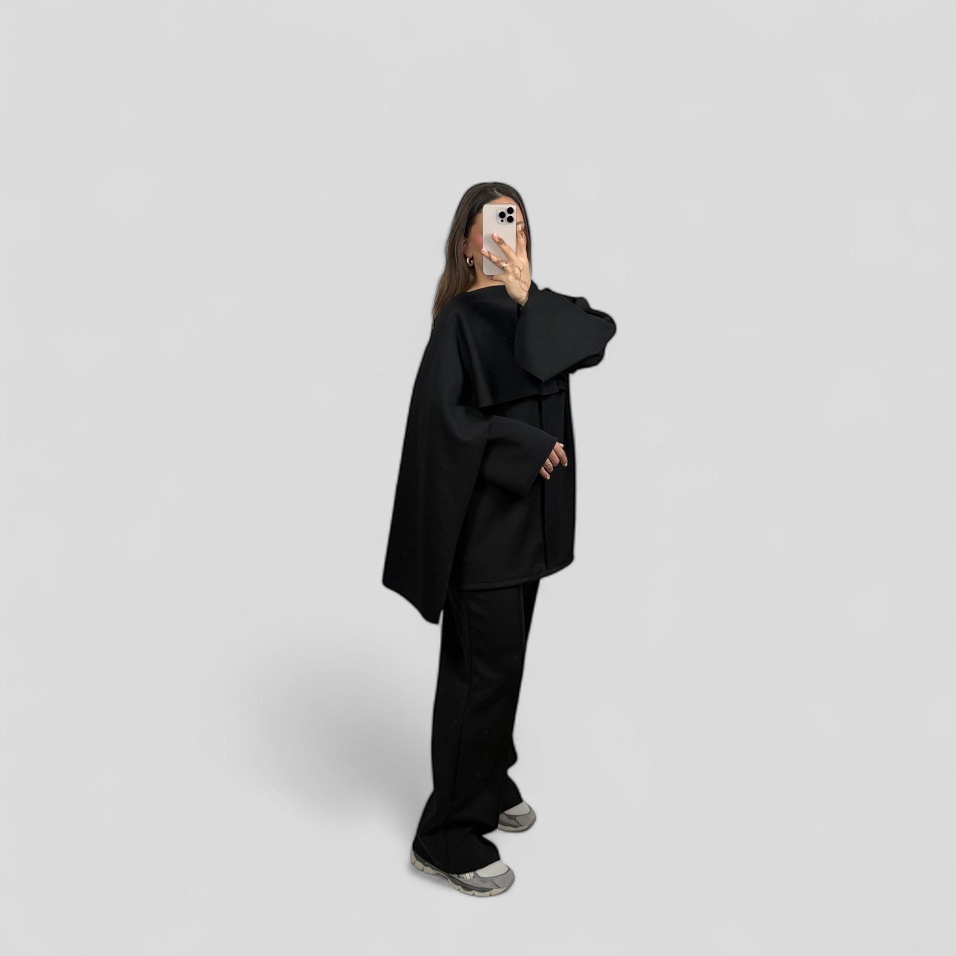 De Serenity Lounge Set combineert minimalisme met elegantie. De losvallende pasvorm en vloeiende stof geven deze set een moderne, verfijnde uitstraling. De top met wijde mouwen en rechte pantalon creëren samen een moeiteloze, stijlvolle look die zowel comfortabel als chic is. Perfect voor een rustige dag thuis of een casual dagje uit.