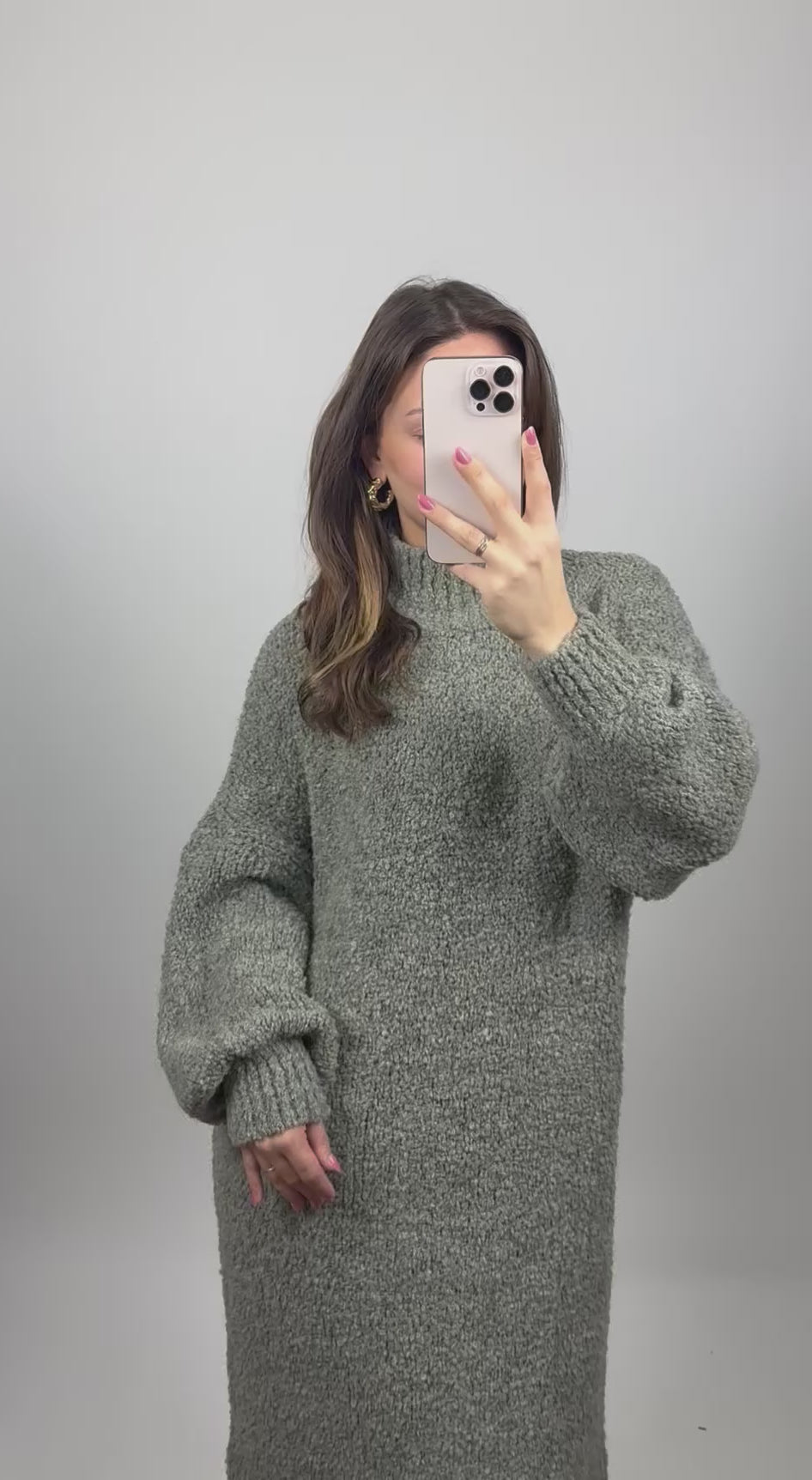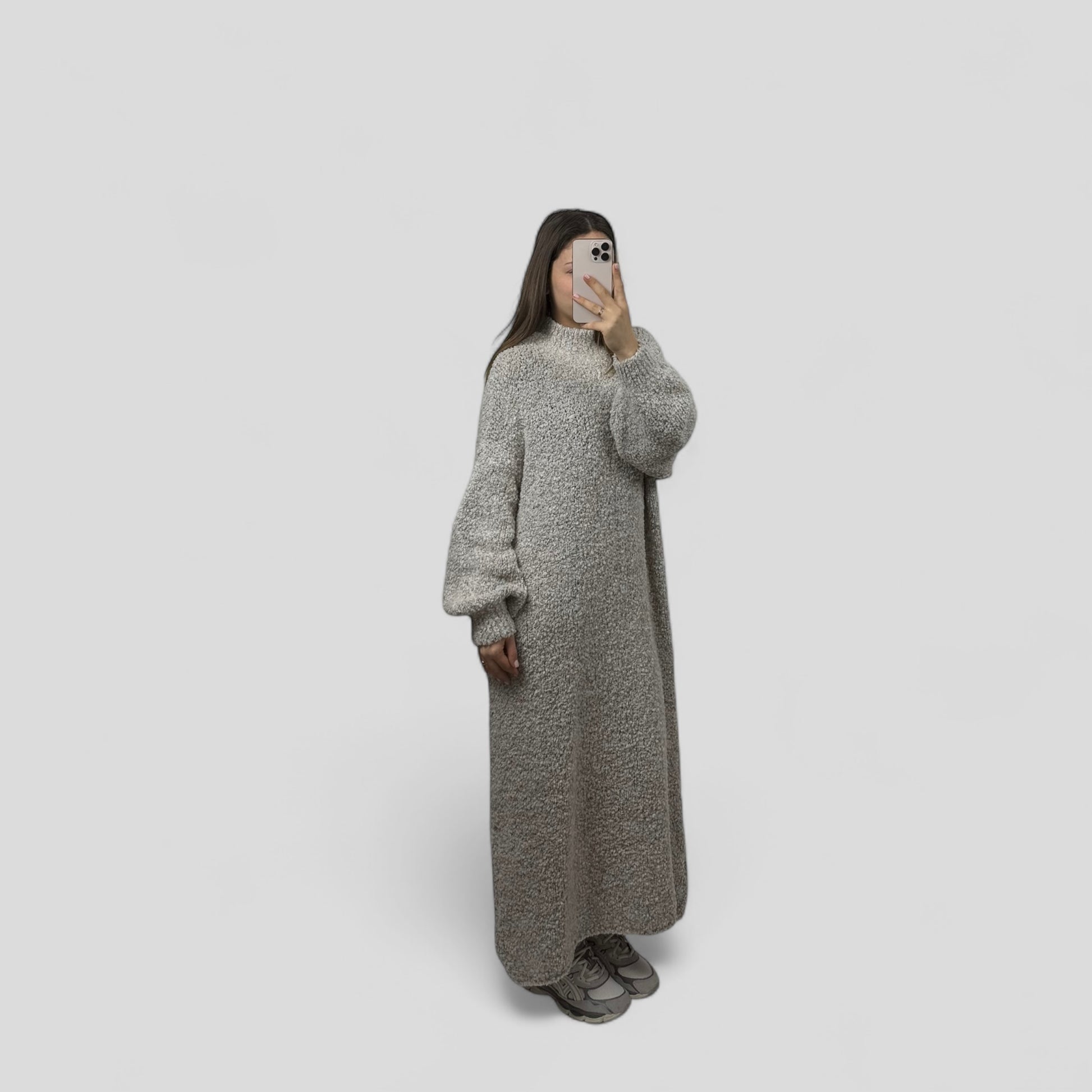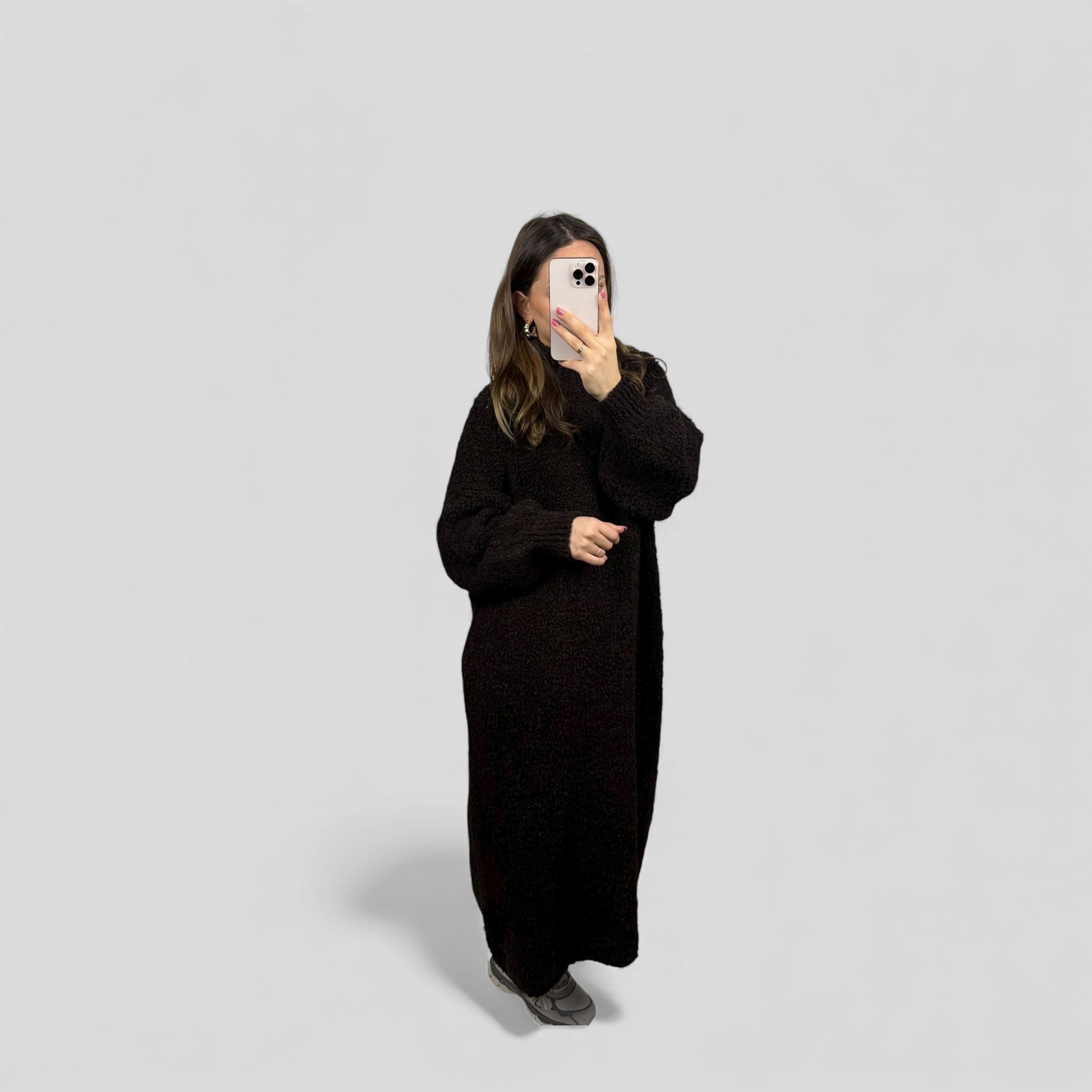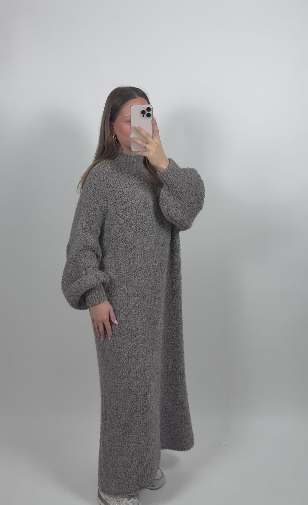 Deze gebreide maxi-jurk straalt warmte en eenvoud uit. De rechte, losse pasvorm valt soepel langs het lichaam en zorgt voor ultiem comfort. Dankzij de hoge hals en lange mouwen is dit een ideale keuze voor koude dagen. Het zachte breisel met subtiele structuur maakt de jurk zowel stijlvol als cosy, perfect voor dagelijks gebruik of een elegante winterse look.