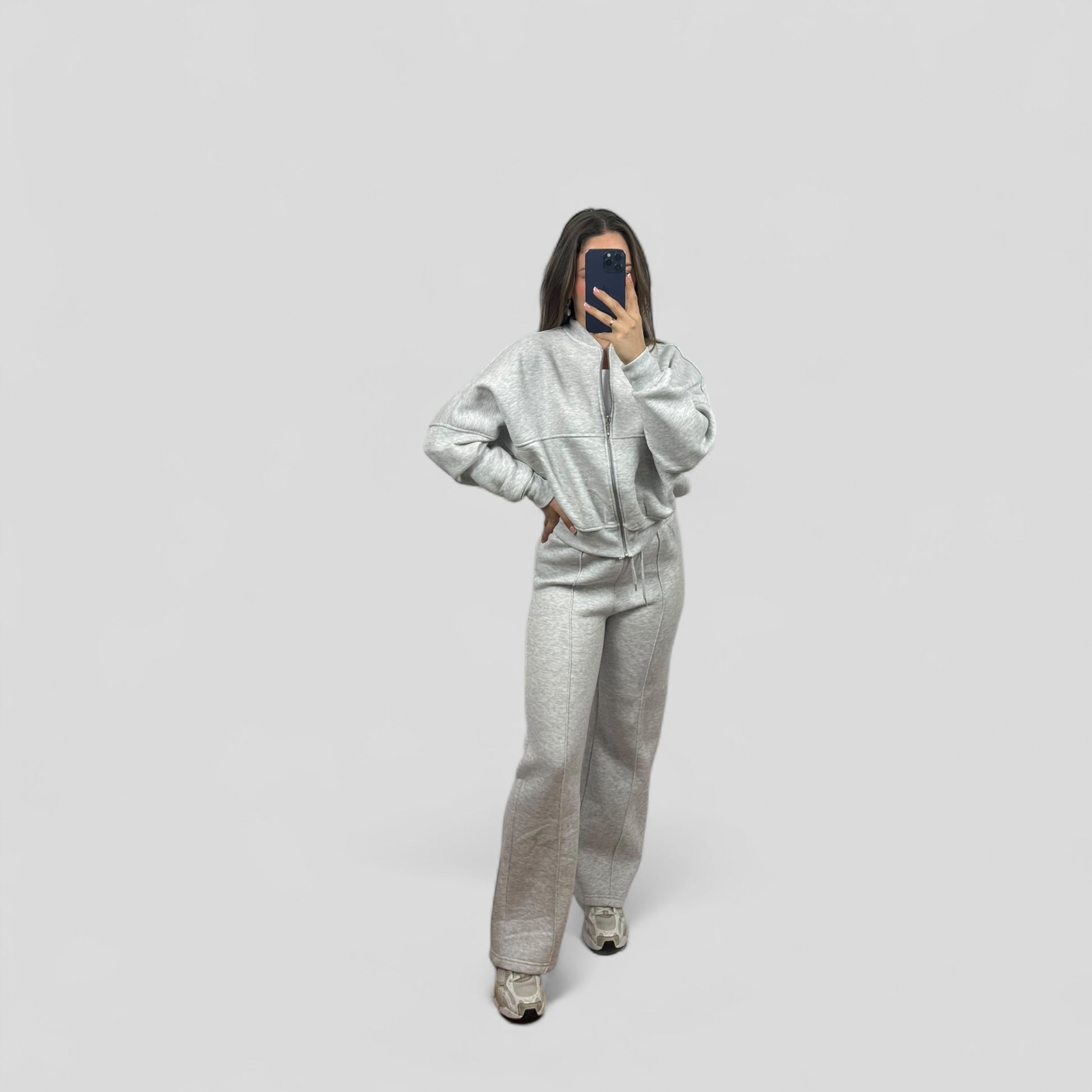 Deze stijlvolle tweedelige tracksuit combineert ultiem comfort met een moderne, minimalistische look. Het zachte materiaal voelt prettig aan op de huid en biedt voldoende bewegingsvrijheid, terwijl de subtiele verticale naden een flatterend en verlengend effect creëren. De set bestaat uit een cropped zip-up sweater met lange mouwen en een rechte broek met hoge taille, ideaal voor zowel casual dagen thuis als een sportieve look buitenshuis.